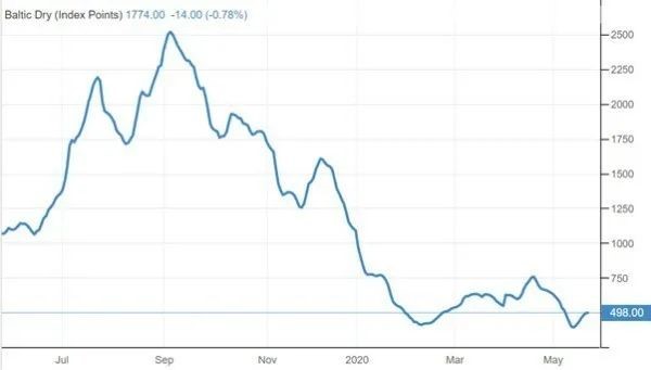 圖3 2019年7月(Jul. )至2020年5月(May. )期間,波羅的海干散貨指數(shù)(BDI)的變化 來源TradingEconomics.com