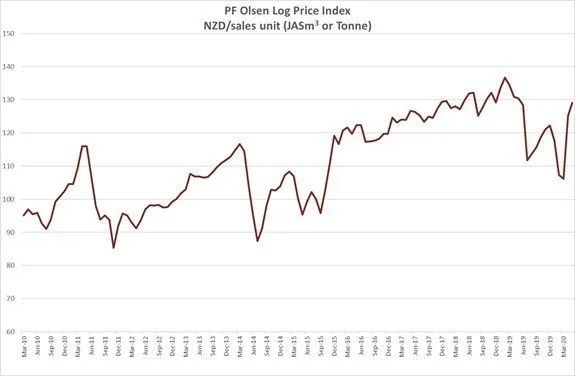 由于原木出口價格的上漲,自2020年3月起,PF奧爾森原木價格指數(shù)(PF Olsen Log Price Index)已經(jīng)上漲了23美元至126美元。自4月開始,碼頭門價格(AWG prices)就沒有被提供,但自從重新開始上線后,原木的供給就緊俏起來。