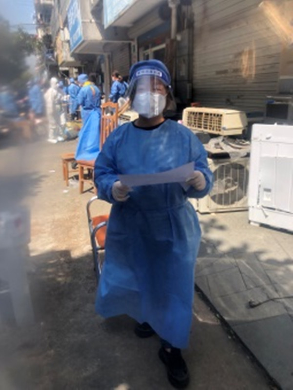 丁軍芳,業(yè)務(wù)主管,12年黨齡的女黨員,工作中獨(dú)當(dāng)一面的她,在厚厚的防護(hù)服和護(hù)目鏡包裹下,每天全副武裝穿梭于小區(qū)的每棟樓宇,是哪里需要人手就出現(xiàn)在哪里的多面手,分送快遞、分發(fā)物資、分配試劑盒、掃碼統(tǒng)計(jì)、清運(yùn)垃圾,起早帶晚、處處都可以見到她忙碌的身影!
